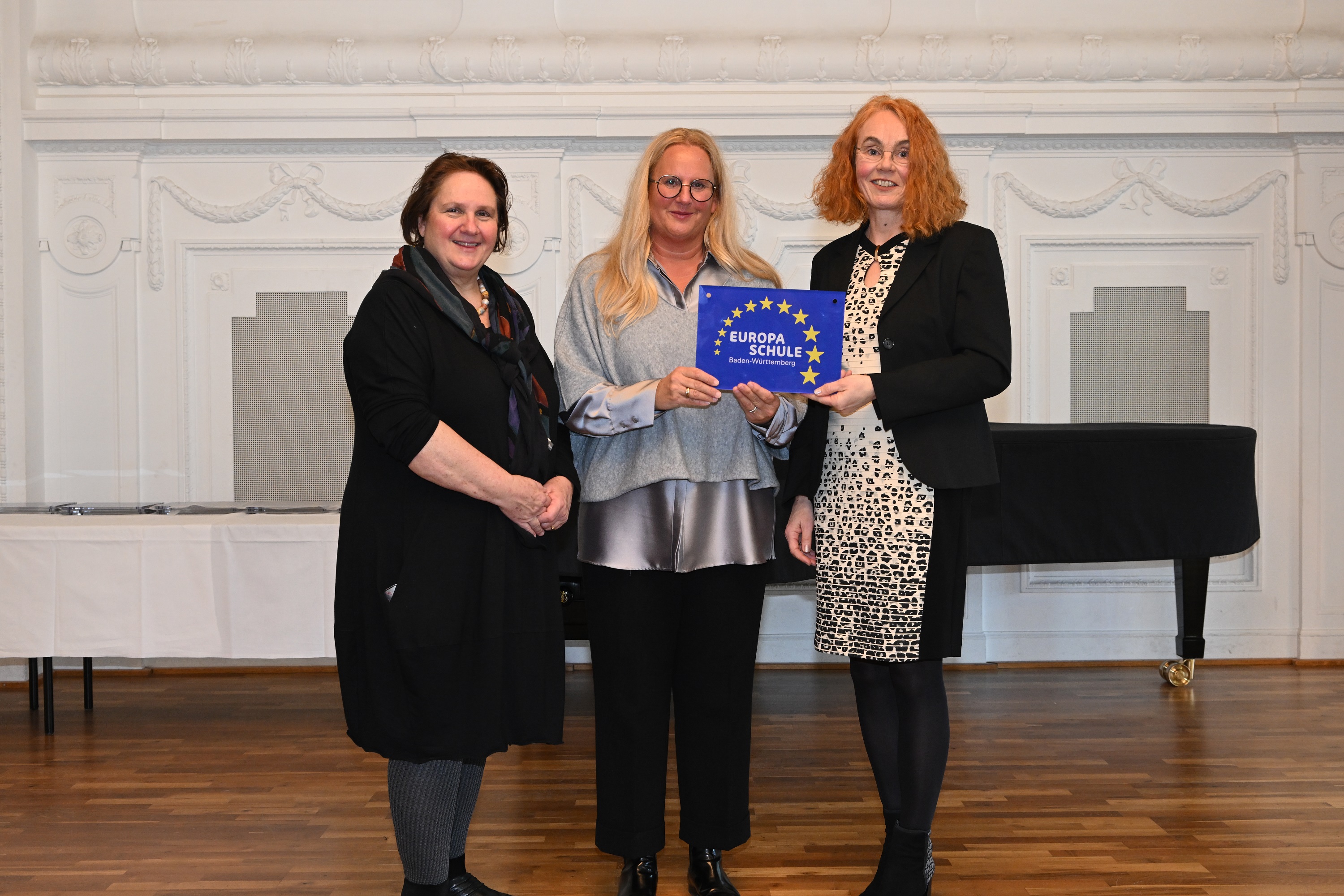 Bei einem Festakt in Stuttgart überreichte Kultusministerin Theresa Schopper der sichtlich erfreuten Schulleiterin Sabine Pföhler und deren Stellvertretung Natascha Becker das neue Schild für das Schulgebäude.